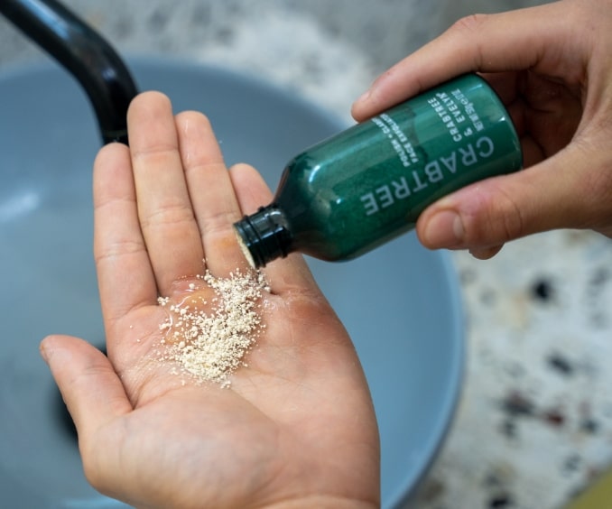 Skin-polishing grains of apple fiber, bamboo extract and illite clay smooth and brighten.